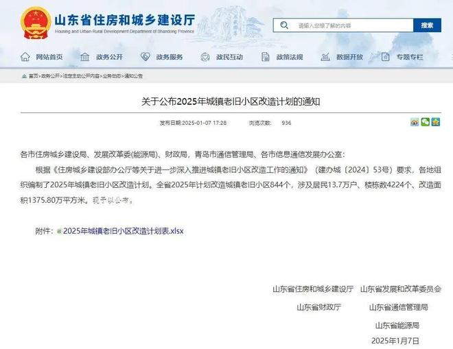 近日,山东省住房和城乡建设厅网站发布《关于公布2025年城镇老旧小区改造计划的通知》,涉及