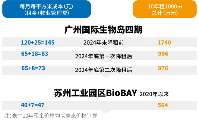 据知情人士介绍,生物岛集团已把最贵的四期物业管理费,从25元直接降至8元,比苏州工业园区BioBAY只贵了1元。这意味着,生物岛四期的场地成本和去年上半年相比,降幅高达50%。据悉,该项政策从2024年11月1日起生效。