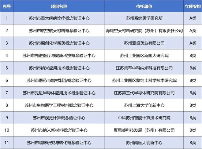 2024年度苏州市成果转化平台建设项目立项名单公示,园区11家单位入选概念验证中心建设项目,占全市38%,位列第一,其中A类项目获批3家,占全市60%。