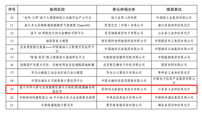 工信部公布人工智能赋能新型工业化典型应用入选案例名单中,苏州市2家上榜,园区同元软控凭借“基于科学计算与系统建模仿真平台的机理-数据融合智能应用”成功入选。