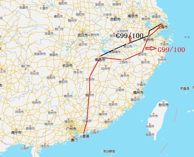 现运行在沪昆高铁、京港高铁线分,停靠上海虹桥、杭州东、金华、上饶、南昌西、赣州西、惠州北、光明城、深圳北、香港西九龙共计10个站点(G100增停河源东)。
