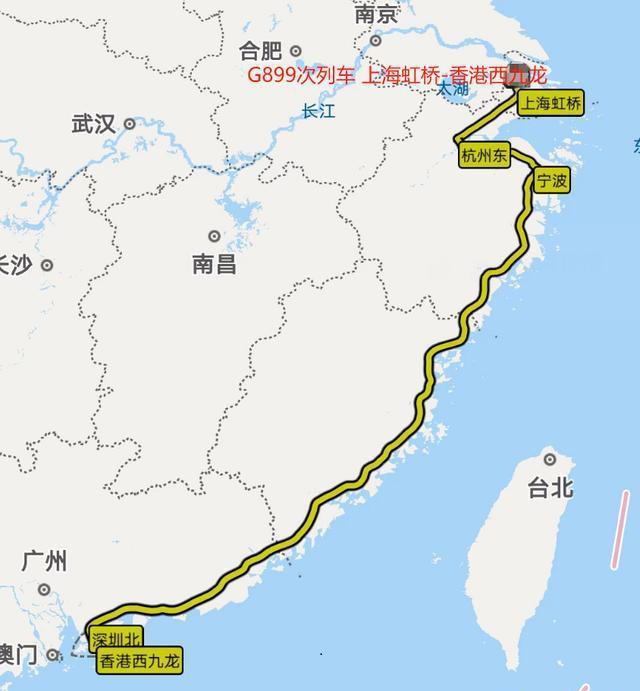 新图中,总里程约1689公里,较现有里程略长一点点。耗时8小时3分,主要因杭黄高铁的线公里标准。
