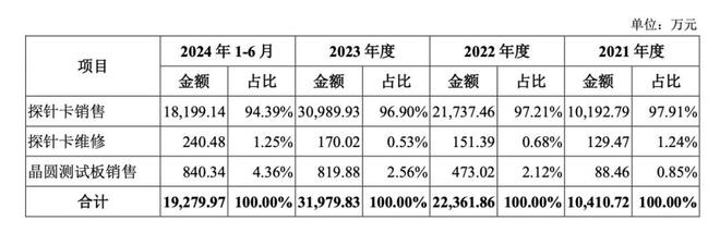 强一股份营收来源却很单一,主要是探针卡销售、维修、晶圆测试版销售,其中探针卡销售营收占比都处于95%左右。