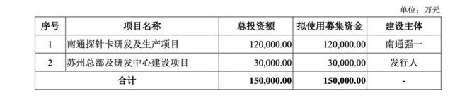 目前强一股份拟募资15亿元,其中12亿元用于南通探针卡研发及生产项目,3亿元用于苏州总部及研发中心建设项目。