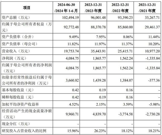 招股书显示,2021年至2024年6月30日,强一股份的营收分别是1.01亿元、2.54亿元、3.54亿元以及1.98亿元,净利润分别是-1335.84万元、1562.24万元、1865.77万元以及4085万元,扣非后净利分别为-377万元、1384万元、1439万元、3660.8万元,年复合增长率达到了79.69%,也是业内比较少见的。