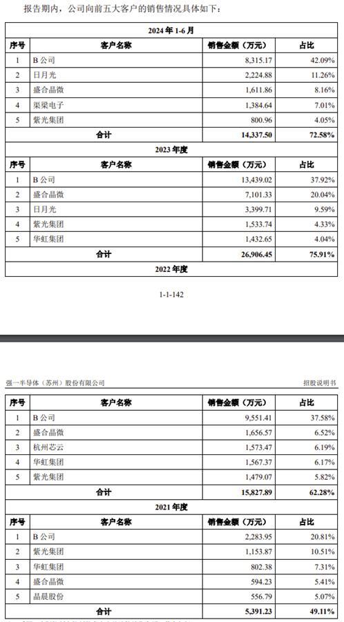 强一股份的前五大客户销售占比集中度高,在报告期内分别是49.11%、62.28%、75.91%和72.58%。尤其是对B公司的依赖较重,销售收入占比分别是25.14%、50.29%、67.47%和70.79%。
