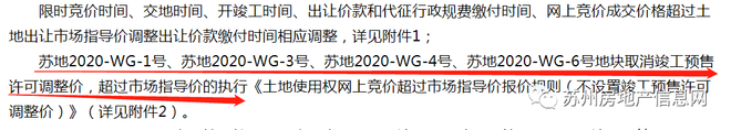 苏地2020-WG-1号、苏地2020-WG-3号、苏地2020-WG-4号、苏地2020-WG-6号地块取消竣工预售许可调整价,超过市场指导价的执行《土地使用权网上竞价超过市场指导价报价规则(不设置竣工预售许可调整价)》(详见附件2)。