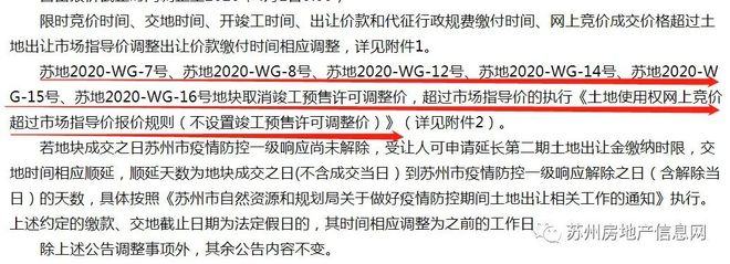 苏地2020-WG-7号、苏地2020-WG-8号、苏地2020-WG-12号、苏地2020-WG-14号、苏地2020-WG-15号、苏地2020-WG-16号地块取消竣工预售许可调整价,超过市场指导价的执行《土地使用权网上竞价超过市场指导价报价规则(不设置竣工预售许可调整价)》(详见附件2)。
