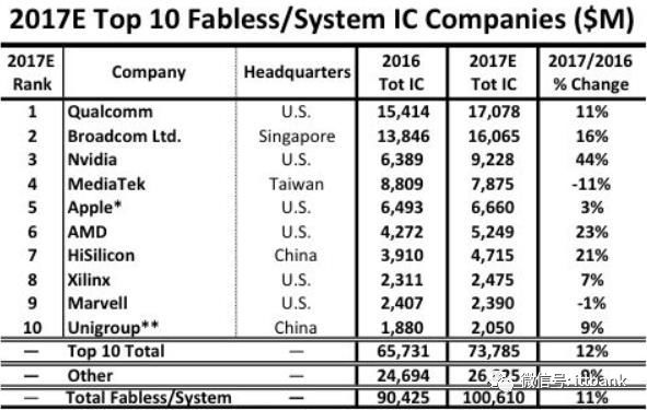 与非美国海外地区相比,中国公司表现突出。世界前50 fabless IC 设计公司中,中国公司数量明显上涨,从2009 年1 家增加至2017 年10 家,呈现迅速追赶之势。2017 年全球前十大Fabless IC 厂商中,美国占据7 席,包括高通、英伟达、苹果、AMD、Marvell、博通、赛灵思;中国台湾地区联发科上榜,大陆地区海思和紫光上榜,分别排名第7 和第10。