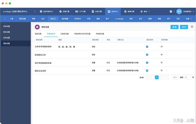 可按照绩效类型、考核项、指标、指标权重、考核权重、平衡系数多维度设定;支持不同类型的指标,如定性指标、定量指标等。