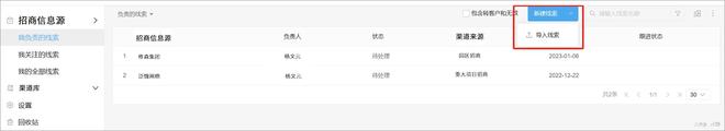 各岗位工作人员可以根据工作情况对自己负责渠道的招商信息源,以手动或者批量的方式导入系统。