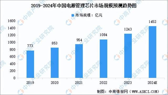 电源管理芯片作为模拟芯片的重要分支,其市场规模持续增长。中商产业研究院发布的《2024-2029年中国电源管理芯片市场调查与行业前景预测专题研究报告》显示,2023年中国电源管理芯片市场规模达到约1243亿元,近五年年均复合增长率达12.60%。随着智能手机、平板电脑等传统消费电子类产品稳步增长,以及下游市场需求的逐步上升,中商产业研究院分析师预测,2024年中国电源管理芯片市场规模将达到1452亿元。