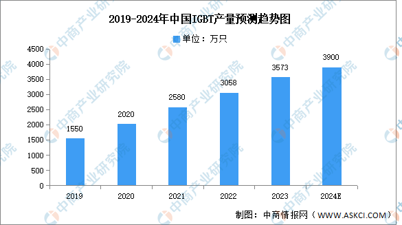 IGBT被称为电力电子行业里的“CPU”,广泛应用于电机节能、轨道交通、新能源汽车等领域。目前在轨道交通领域已经实现技术突破,在新能源汽车领域,IGBT是电控系统和直流充电桩的核心器件,我国IGBT产量快速增长。中商产业研究院发布的《2024-2030年中国IGBT行业市场前景预测及未来发展趋势报告》显示,2022年中国IGBT产量达3058万只,同比增长26.5%,2023年产量约为3573万只。中商产业研究院分析师预测,2024年中国IGBT产量将达到3900万只。
