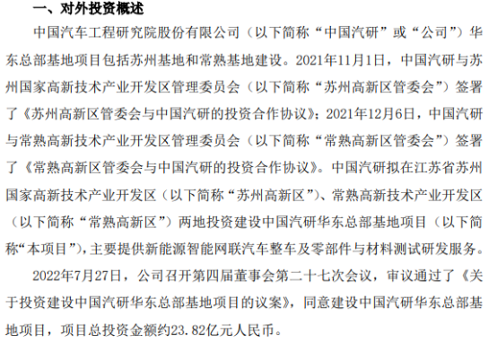 项目投资金额:中国汽研华东总部基地项目包括苏州基地和常熟基地,本项目总投资23.82亿元人民币。