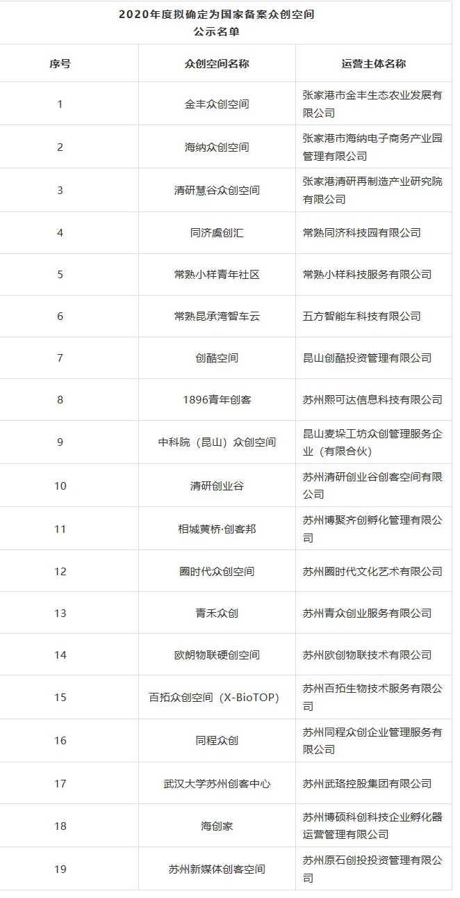 近日,科技部火炬中心发布了《2020年度拟确定为国家备案众创空间名单》,苏州共有19家众创空间拟确定为国家级,数量位居全省*一。